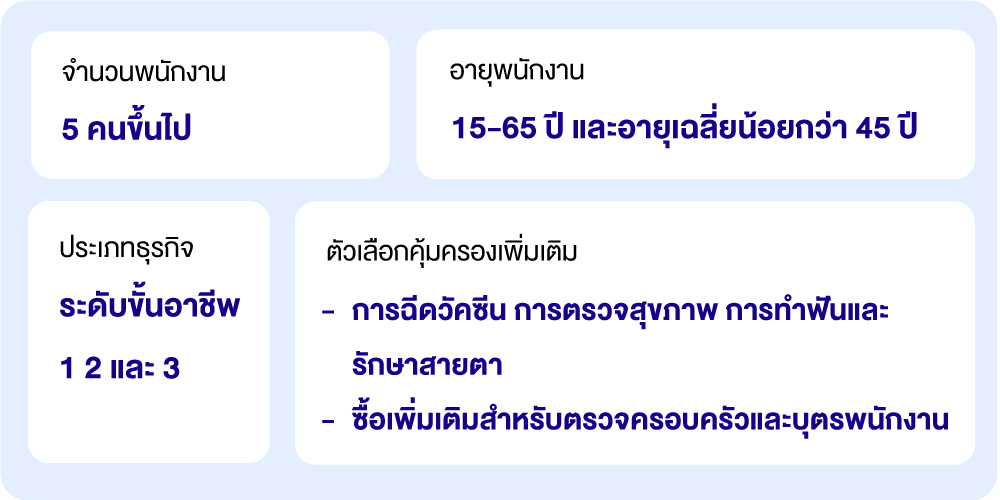 ท่านสมัครแผนประกันกลุ่ม Smart Health for SMEs ให้กับพนักงานของท่านได้ เพียงมีพนักงานอายุ 15 - 65 ปีที่ทำงานเต็มเวลา 5 คนขึ้นไป ณ วันเริ่มกรมกรรม์ โดยพนักงานทุกคนในกรมธรรม์จะต้องมีชื่ออยู่ในระบบประกันสังคม