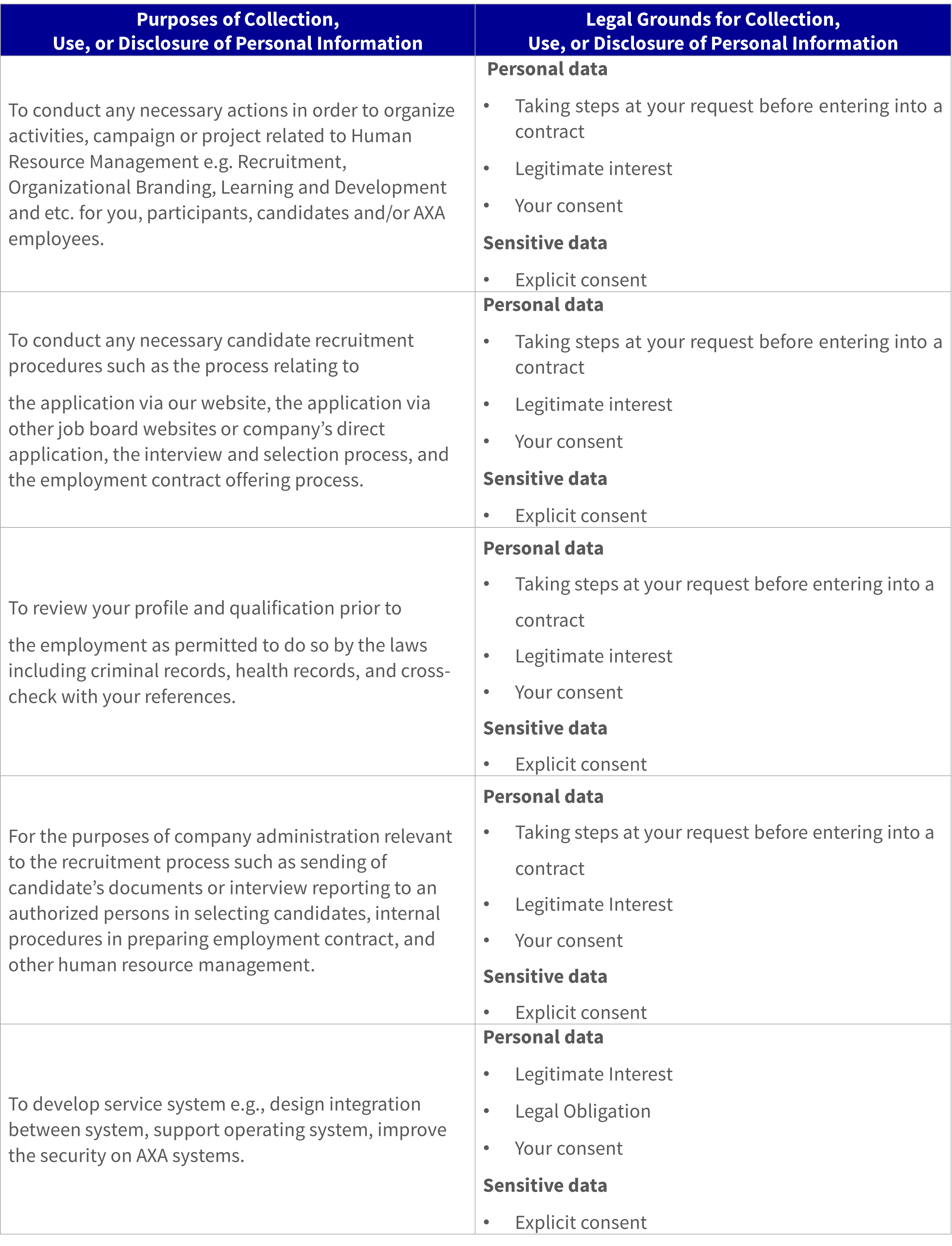 AXA Insurance Public Company Limited (“AXA” or “we”) recognizes the importance of protecting the participants of Human Resource Management Activities and/or the candidate’s ("You”) personal data including sensitive data, so we have prepared this privacy notice to inform you of the collection, use, disclosure, and international transfer of your personal data and sensitive data. Hereinafter, personal data and sensitive data will be mentioned as Personal Information.