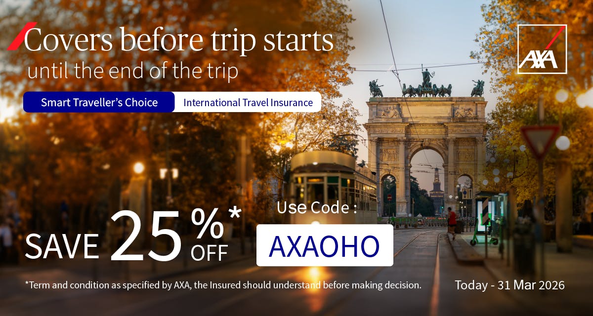 1. This promotion is only valid for the purchase of Advance or Max plan on online purchase via the website https://direct.axa.co.th/travel/inter of AXA Insurance Public Company Limited and must use code AXAOHO, Today - 31 March 2026.