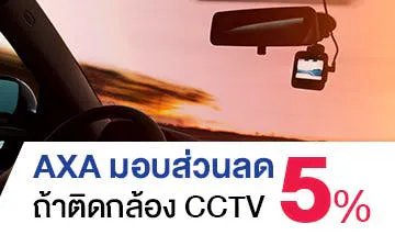ทางบริษัทพิจารณาให้ส่วนลด 5% ทั้งนี้ลูกค้าสามารถกรอกแบบฟอร์มพร้อมแนบหลักฐานรูปถ่ายกล้อง CCTV ที่ติดตั้งในรถยนต์ของท่านพร้อมกรอกเอกสารแบบฟอร์มยืนยันการติดตั้งกล้องโทรทัศน์วงจรปิด (CCTV) ที่ติดตั้งกับรถ เข้ามาให้บริษัทพิจารณา โดยส่งเอกสารดังกล่าวมาที่ axathai@axa.co.th หรือ โทร 02-118-8111 หรือ สามารถติดต่อได้ที่สาขาบริษัท แอกซ่า ที่ใกล้ท่าน