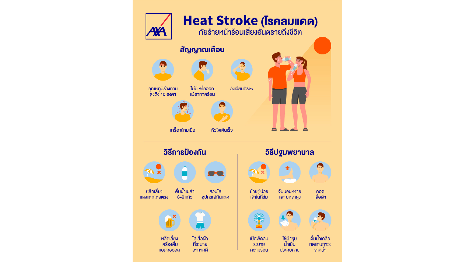 จะเกิดขึ้นเมื่อร่างกายอยู่ในพื้นที่ที่มีความร้อนมากเกินไป แต่ร่างกายไม่สามารถระบายความร้อนภายในออกมาได้ จึงทำให้อุณหภูมิร่างกายสูงขึ้นเรื่อย ๆ จนนำไปสู่อาการชัก ช็อก และอาจจะเสียชีวิต สามารถพบในคนวัยหนุ่มสาวที่ทำกิจกรรม หรือ ออกกำลังกายอย่างหนักเป็นระยะเวลานาน ทั้งกลางแจ้ง และในสภาพอากาศที่ร้อนจัด จนสมองในส่วนการควบคุมอุณหภูมิของร่างกายทำงานผิดปกติ ทำให้มีอุณหภูมิในร่างกายสูงเกิน 40 องศาเซลเซียส ซึ่งส่งผลต่อระบบไหลเวียนโลหิต และระบบสมอง แอกซ่าได้รวบรวม สัญญาณเตือน วิธีการป้องกัน และการปฐมพยาบาลโรคลมแดด (Heat Stroke) ดังนี้