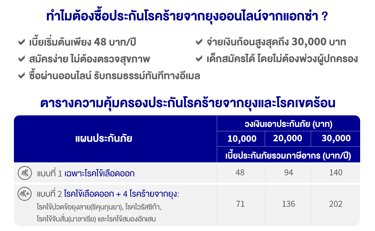 ✨ พร้อมเพิ่มการป้องกันตัวเองและคนที่รักจากโรคไข้เลือดออกให้มากขึ้นด้วย ประกันโรคไข้เลือดออก สมัครง่าย ไม่ต้องตรวจสุขภาพ เบี้ยเริ่มต้นเพียง 48 บาท / ปี 📱 ซื้อออนไลน์ได้แล้ววันนี้ รับกรมธรรม์ทันทีทางอีเมล