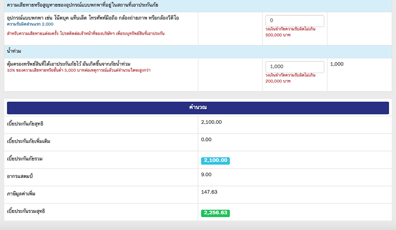 ในบริษัทที่มีการเปิดให้ซื้อผ่านออนไลน์จะสามารถลองกดคำนวณโปรแกรมดูได้ ทั้งในส่วนการเลือกการประกันภัยเป็นประเภทคอนโดมิเนียม มีค่าสิ่งปลูกสร้างเท่าไหร่ ค่าทรัพย์สินภายในสิ่งปลูกสร้างอีกเท่าไหร่ และจะเลือกเป็นความคุ้มครองโปรแกรมหลักที่มีทุนประกันภัยเท่าไหร่ นอกจากนั้นก็จะเป็นรายละเอียดปลีกย่อยซึ่งสามารถกดเลือกหัวข้อการขยายความคุ้มครองเพิ่มเติมในส่วนที่ประกันภัยหลักไม่ครอบคลุมได้ทั้งหมด หรือจะเลือกแค่บางอันก็ได้ เมื่อเลือกจนคิดว่าพอใจแล้วก็กดคำนวณ โปรแกรมออนไลน์ก็จะแสดงเบี้ยประกันภัยออกมา เป็นเบี้ยประกันภัยสุทธิบวกค่าอากรแสตมป์และภาษีมูลค่าเพิ่ม รวมเป็นค่าเบี้ยประกันภัยที่ต้องจ่าย โดยถ้าเรารู้สึกว่าเบี้ยประกันสูงเกินไปหรือต่ำเกินไปก็สามารถกลับไปกดเปลี่ยนใหม่ แล้วลองรันโปรแกรมไปเรื่อยๆจนกว่าจะพอใจ