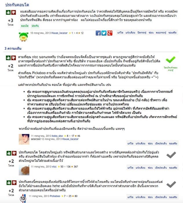 การทำประกันคอนโดมิเนียมนั้นแม้จะมีมาซักพักหนึ่งแล้ว แต่ยังไม่เป็นที่แพร่หลายและไม่ได้เป็นที่รู้จักจากผู้ซื้อคอนโดมิเนียมเท่าที่ควร ทำให้จะมีผู้ที่ให้ความสนใจตั้งคำถามอย่างคุณ House_locator มาตั้งกระทู้ไว้ใน Web board ของเราเกี่ยวกับประกันคอนโดมิเนียม ซึ่งเพื่อนสมาชิกเราก็จะไปช่วยกันให้ความเห็น พูดคุย และแลกเปลี่ยนความคิดกันในกระทู้ ส่วนใครที่อยากเข้าไปร่วมแจมใน Web board ก็สามารถทำได้โดยการ คลิกที่นี่