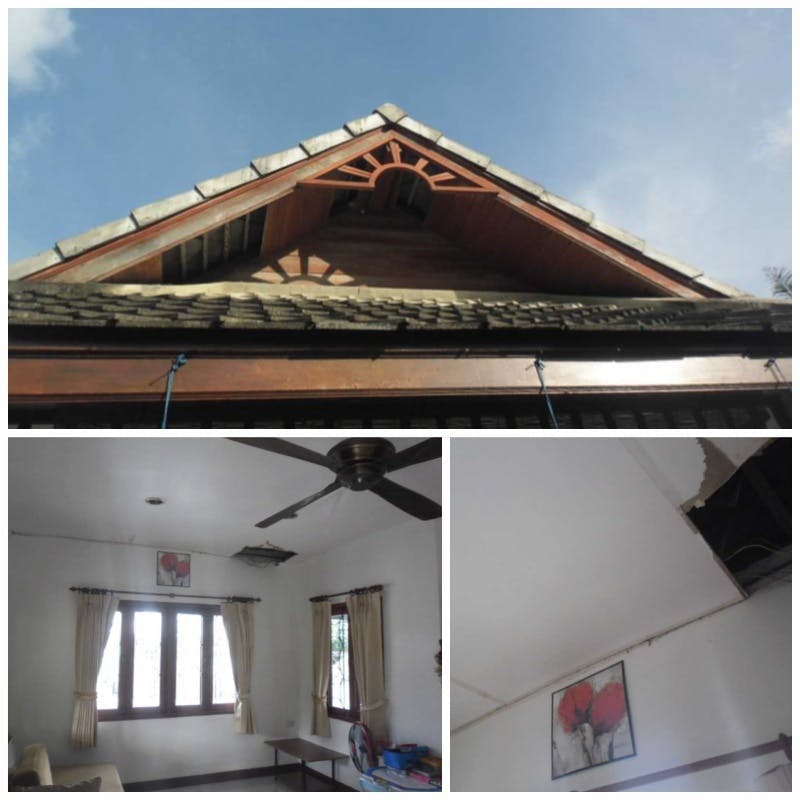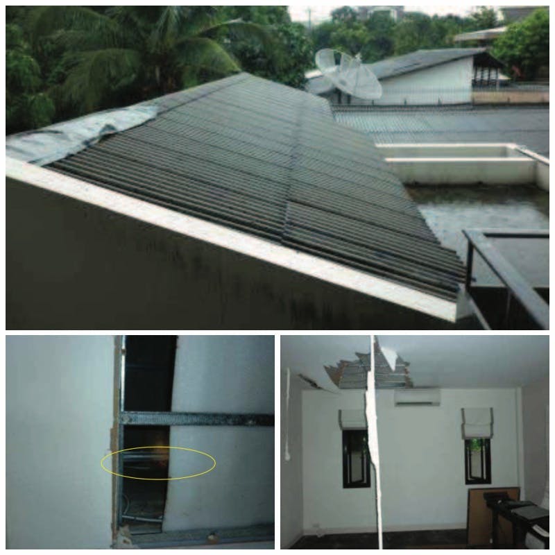–> สาเหตุนี้สามารถแก้ไขเหตุการณ์เฉพาะหน้าได้ด้วยการเอาผ้ายางคลุมหลังคา หรืออุดรอยรั่วชั่วคราวด้วยเทปกาว แต่ก็จะต้องมีการรื้อหลังคาแล้วมุงใหม่เป็นการถาวรในอนาคตอีกอยู่ดีค่ะ