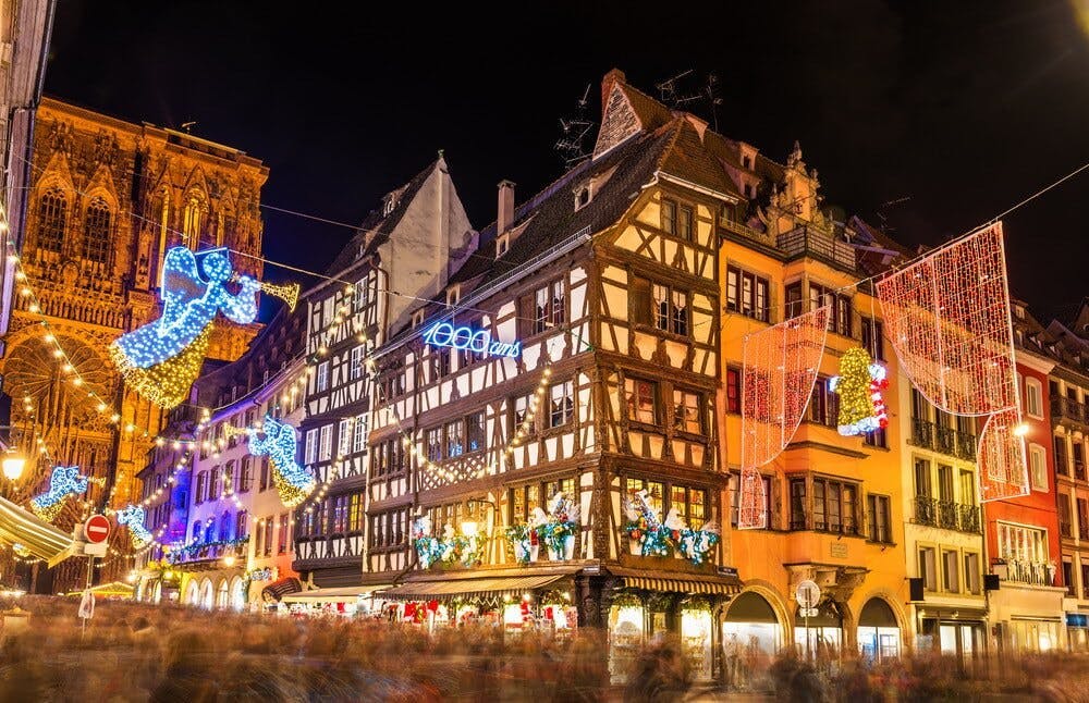 ในแต่ละปี เทศกาลคริสต์มาสที่จัดกินเวลายาวนานที่สุดอยู่ที่เมือง Strasbourg เมืองท่องเที่ยวสำคัญในแคว้น Alsace ทางตะวันออกของประเทศฝรั่งเศส ใกล้กับพรมแดนเยอรมนี โดยจัดกันยาวนานเป็นเดือน ทำให้ตั้งแต่เดือนธันวาคมถึงมกราคมกลายเป็นช่วงเวลาที่ผู้คนแน่นขนัดตลอด โดยส่วนมากแล้วนิยมเดินทางมาเลือกซื้อสินค้าทำมือในธีมคริสต์มาสที่มีรายละเอียดแตกต่างกันไปในทุกปี